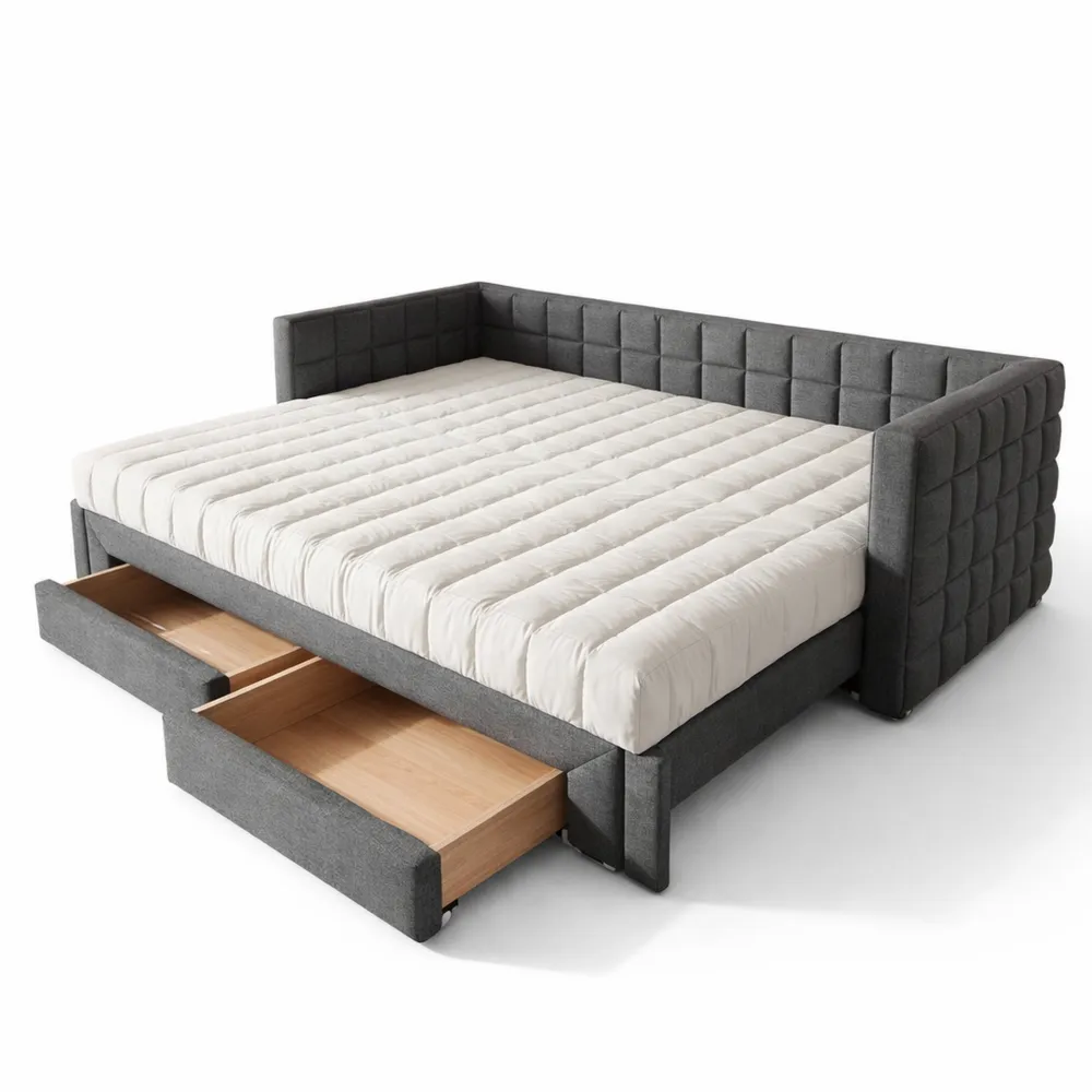 Samtstoffe und MDF-Rahmen bieten eine angenehme Oberfläche und Stabilität. Die quadratische Rückenlehne mit Mustern passt gut in verschiedene Räume. Das Schlafsofa lässt sich in ein Bett umwandeln, ideal für den täglichen Gebrauch oder gelegentliche Übernachtungen. Zwei Schubladen an der Unterseite bieten praktische Aufbewahrungsmöglichkeiten. Eine Anleitung zur einfachen Montage ist enthalten.