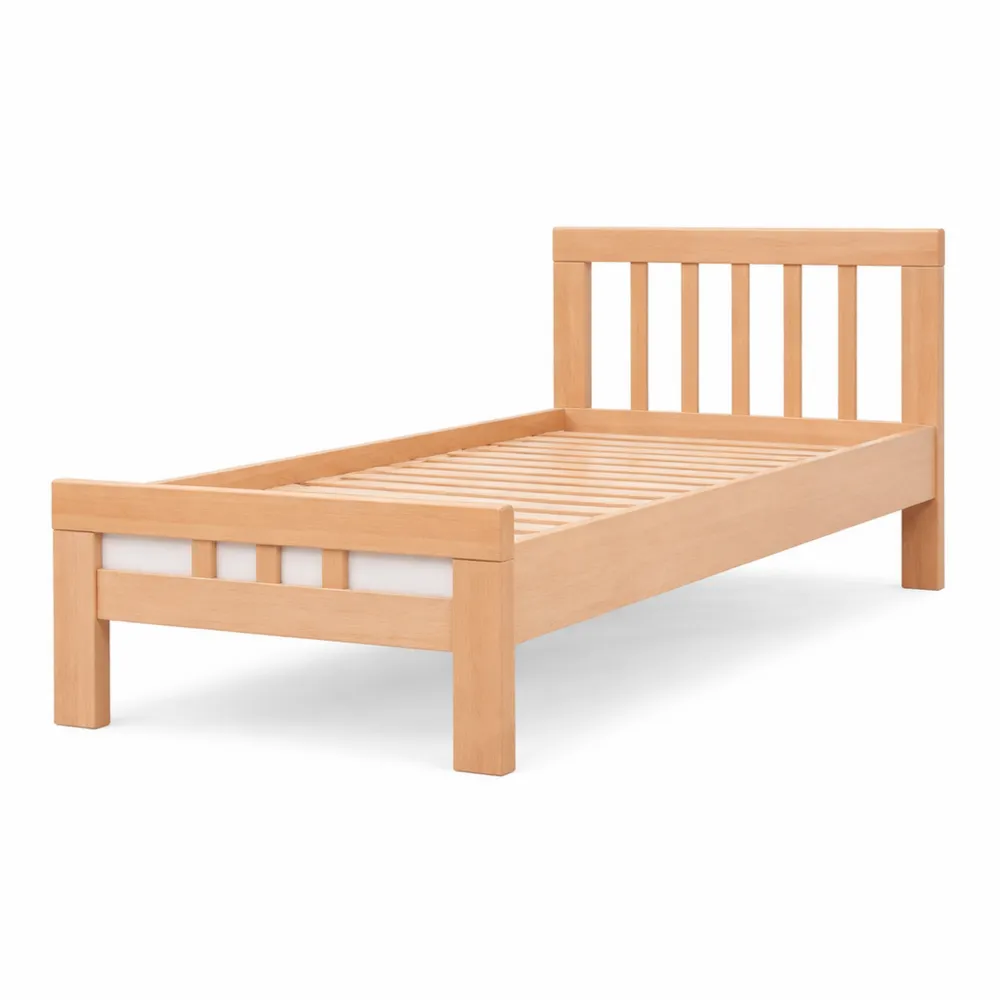 Holzmaterialien ineinander verkeilt und verleimt bieten Stabilität. Lattenrost aus Lindenholz ist enthalten. Das Bett besteht aus massivem Buchenholz. Maße: Höhe Kopfende: 97,5 cm, Höhe Fußende: 49,5 cm, Gesamtbreite: 96,5 cm, Gesamtlänge: 208 cm, Liegefläche: 90 x 200 cm.
