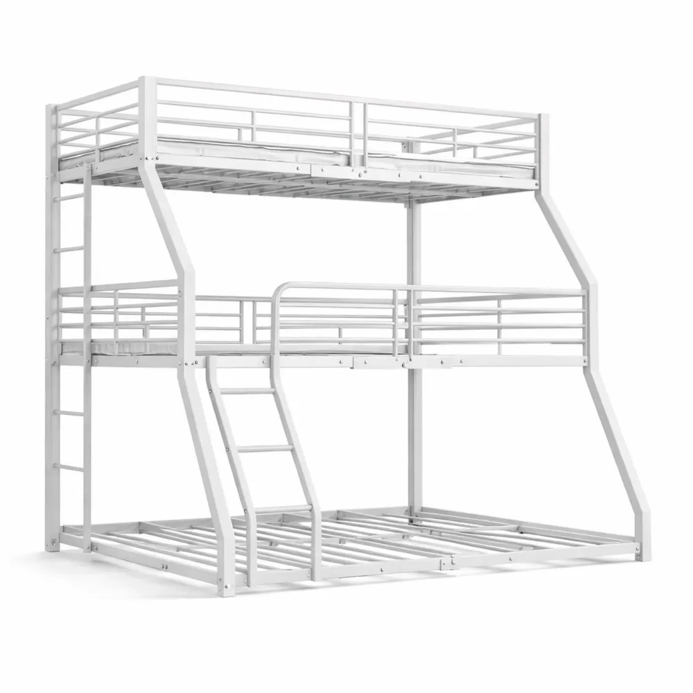 Das Dreifach-Etagenbett besteht aus einem stabilen Stahlrahmen und ist für den langfristigen Gebrauch konzipiert. Es nutzt den vertikalen Raum optimal und bietet somit eine platzsparende Lösung für Familien. Ausgestattet mit zwei Leitern ermöglicht es einen sicheren Zugang zu den Etagen, die durch stabile Geländer geschützt sind. Geeignet für Kinder ab sechs Jahren nach EN747 Norm, bietet das Bett zusätzlichen Schutz gegen Stürze.