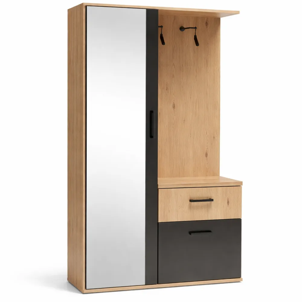 Diese Flurgarderobe mit integriertem Spiegel bietet funktionalen Platz und optisch mehr Raum im Vorzimmer. Die drei Regalflächen und die Kleiderstange hinter den Spiegeltüren ermöglichen eine geordnete Aufbewahrung von Jacken, Mützen und Accessoires. Der Schuhschrank ergänzt die Garderobe und sorgt für eine strukturierte Organisation der Schuhe. Die flexible Montageoption erlaubt eine Anpassung an verschiedene Raumkonfigurationen. Maße: Länge: 97 cm, Tiefe: 30 cm, Höhe: 195 cm.